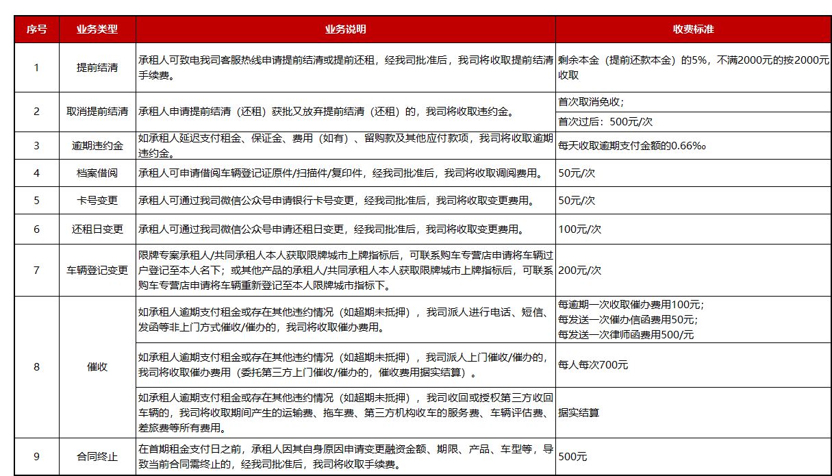 2. 以上收费标准为东风日产融资租赁有限公司最新实行的收费标准,本公司在法律法规允许的范围内享有对收费标准的解释权。如有疑问,可咨询客服热线400 830 0030。